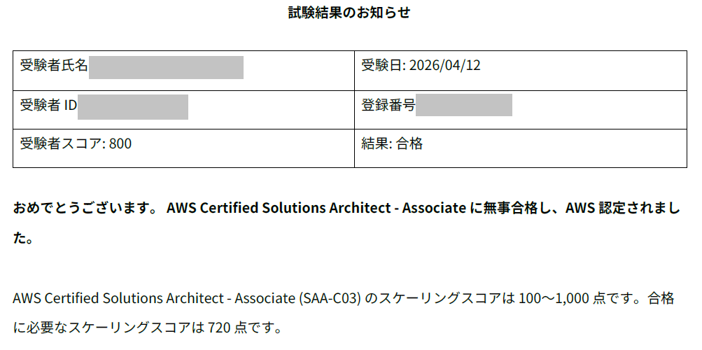 - 2026/4/12にAWS SAAを受験し、800点で合格しました。